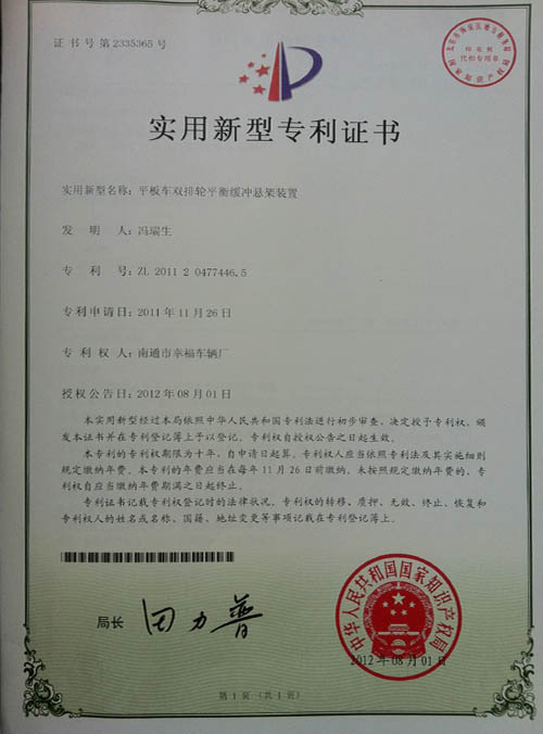 平板車雙排輪減震緩沖懸架裝置專利證書(shū)